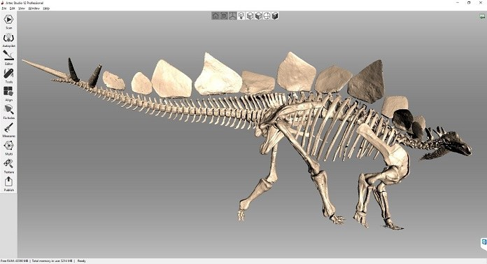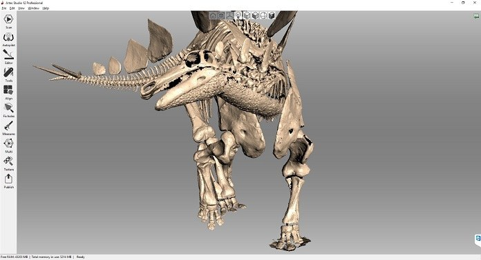 Artec Studio中的濾網(wǎng)功能使導(dǎo)出后的網(wǎng)格毫無人為痕跡,這一功能移除了所有小于主掃描的元素。小空洞通過Artec Studio中的空洞填補算法自動填補。“若我們掃描未組裝的單獨骨骼塊,那么使用Artec Studio生成完整水密性網(wǎng)格就會非常簡單,無需進行任何后期處理,”Matt說道?!翱紤]到要移除鋼制支架,以及需要重建遮擋部分,水密網(wǎng)格對重建Stegosaurus而言并不可行,也無必要。”